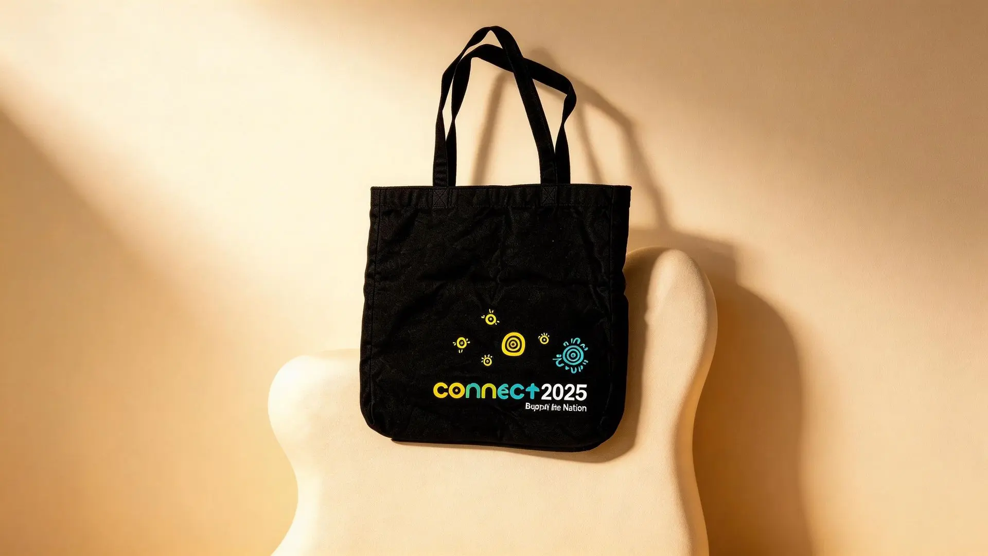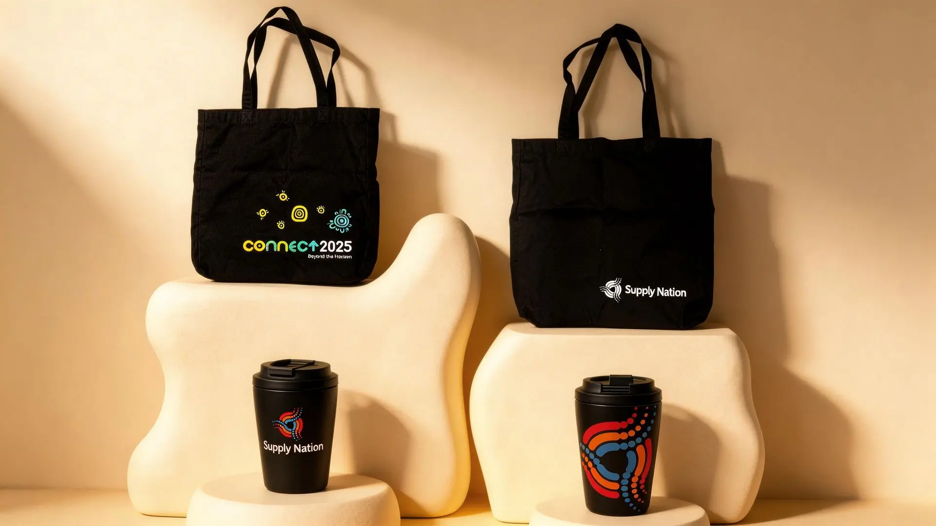 A client required a range of premium merchandise featuring intricate Indigenous artwork for Supply Nation. The creative brief demanded edge-to-edge (full-bleed) printing on notebooks and tote bags, as well as seamless circular branding on tapered reusable coffee cups.